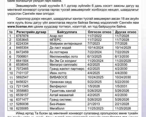 Сангийн яамны нэр барьж хууль бус сугалаагаар иргэдийг хохироож байна 2026-01-19 Сүүлийн үед зарим цахим хуудсаар “Сангийн яамны тусгай зөвшөөрөлтэй албан ёсны сугалаа” гэх хуурамч бичиг баримт үзүүлж, эд мөнгөний хонжворт сугалаа борлуулж, иргэдийг хохироосон