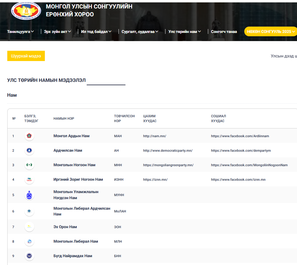 2026-02-27 Онцлох·Улс төр Улс төрийн намуудын тайлан нийтлэгдлээ Сонгуулийн ерөнхий хорооны m-election.mn цахим сайтын “Улс төрийн нам” цэсэд улс төрийн намын 2025 оны жилийн эцсийн санхүүгийн тайлан Цааш нь
