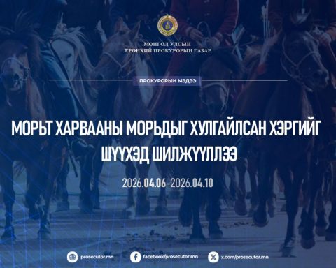 Морьт харвааны морьдыг хулгайлсан хэргийг шүүхэд шилжүүлжээ 2026-04-13 Прокурорын байгууллага 2026 оны 4 дүгээр сарын 06-ны өдрөөс 10-ны өдрийг хүртэлх хугацаанд хэрэг бүртгэлт, мөрдөн байцаалтын 47,384 хэрэгт хяналт тавьжээ. Дээрх хугацаанд 1,548