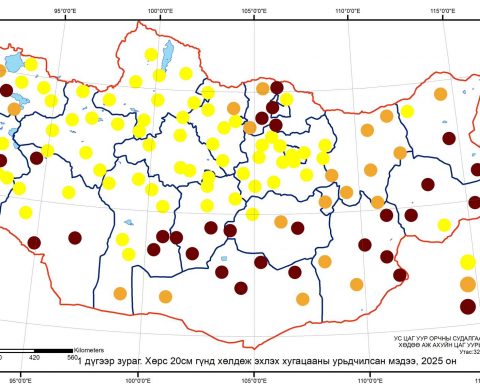 Newstime·Ногоон дэлхий Энэ сарын дунд 10 хоногт хөрс 20 см гүнд хөлдөж эхэлнэ 2025-10-02 admin Ус цаг уур, орчны судалгаа мэдээллийн хүрээлэнгээс хөрс 20 см гүнд хөлдөж эхлэх хугацааг тооцоолон гаргасан байна. Уг тооцооллоор Өмнөговь, Дорноговь, Дорнод, Сүхбаатарын ихэнх, Цааш нь