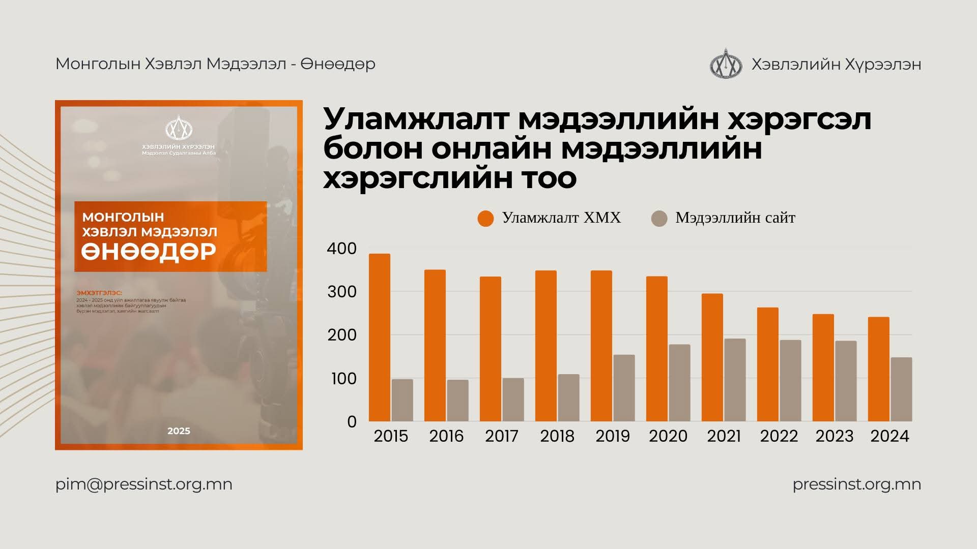 Монголын хэвлэл мэдээлэл – өнөөдөр” судалгааны зр дүнгээс онцлон энэхүү графикийг танилцуулж байна. Энд үзүүлснээр сүүлийн арван жилийн хугацаанд онлайн мэдээллийн хэрэгсэл буюу мэдээллийн сайтын тоо өсөж байна. Харин эсрэгээрээ уламжлалт мэдээллийн хэрэгслийн тоо буурах хандлагатай байна. Уламжлалт мэдээллийн хэрэгсэлд телевиз, радио, сонин, сэтгүүлийг хамруулж авч үзжээ.