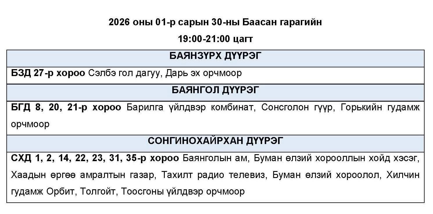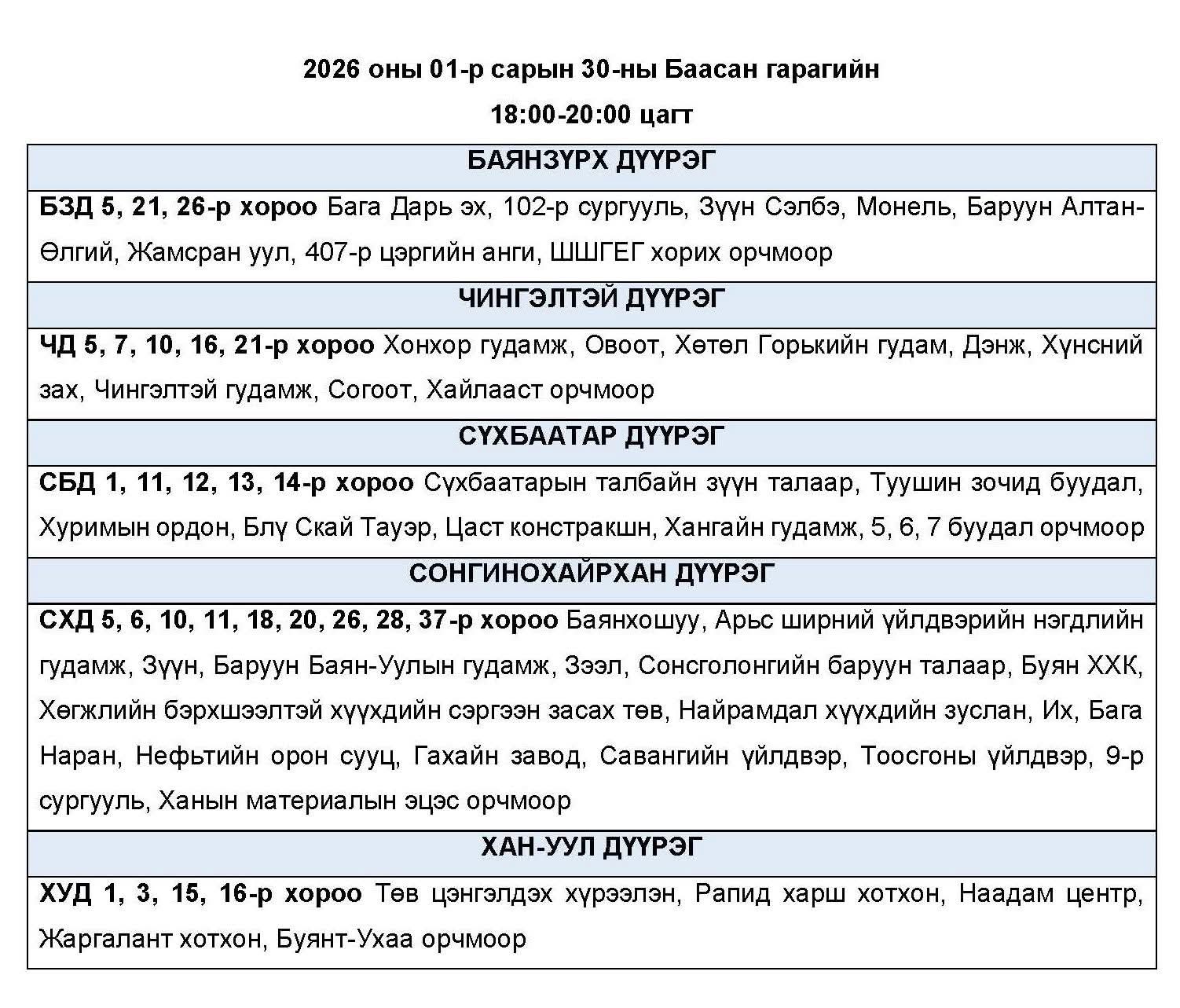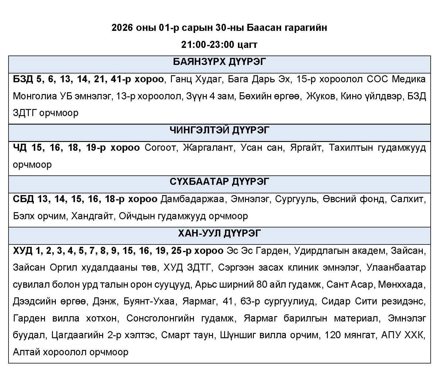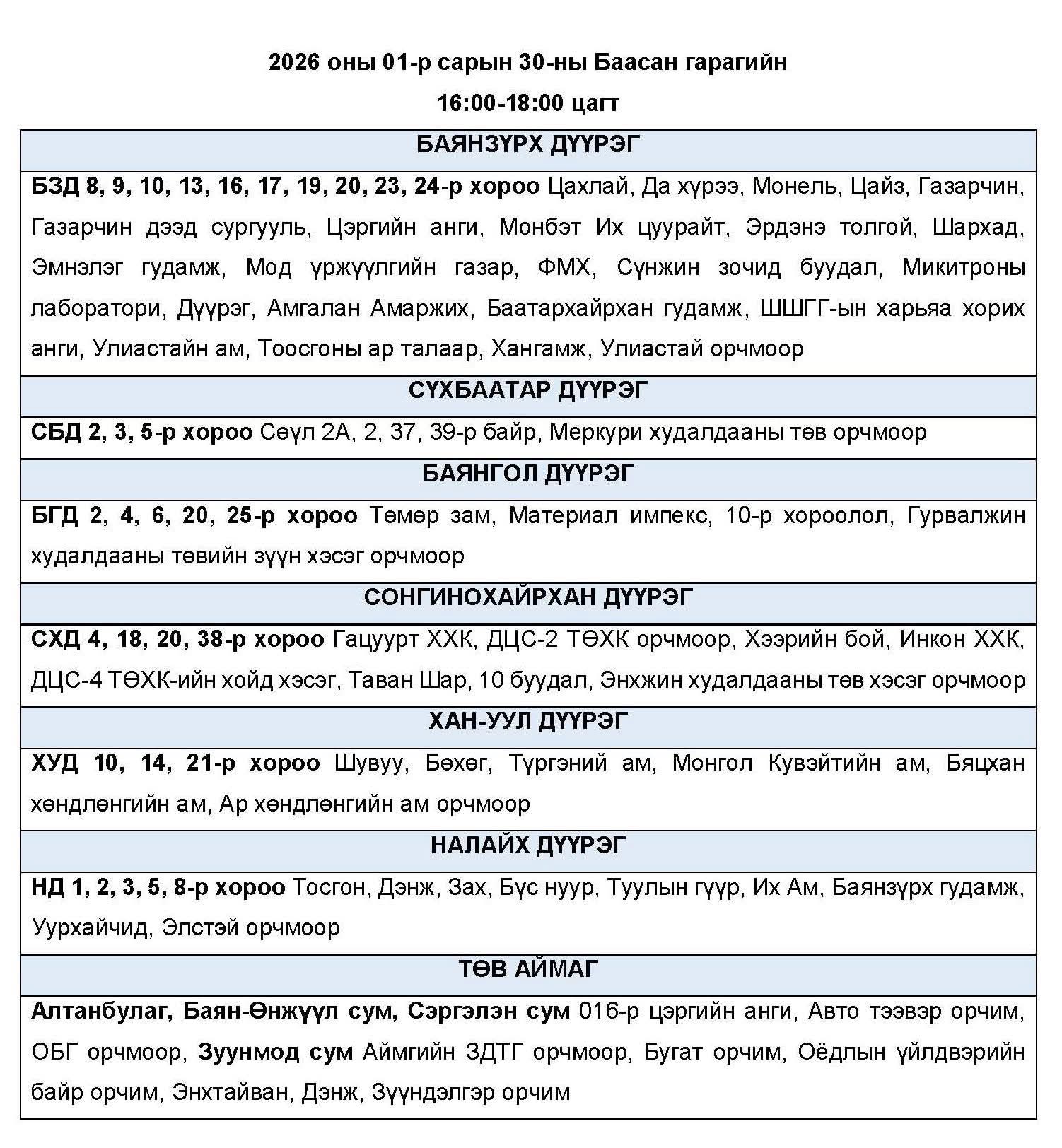 Эрчим хүчний системд аваарын горим үүсэхээс сэргийлэн нэгдсэн сүлжээнд холбогддог тодорхой байршлуудад цахилгаан эрчим хүчний төлөвлөсөн хэрэглээг “Диспетчерийн үндэсний төв” ТӨХХК-ийн шийдвэрээр хуваарийн дагуу 2 цагийн хугацаатай хязгаарлах арга хэмжээ авч байна.