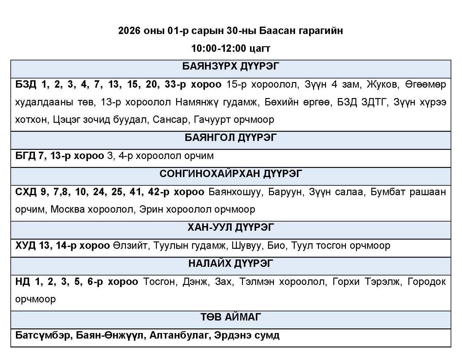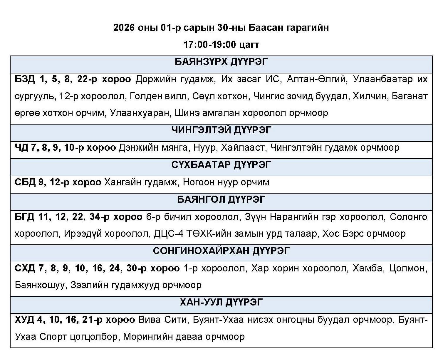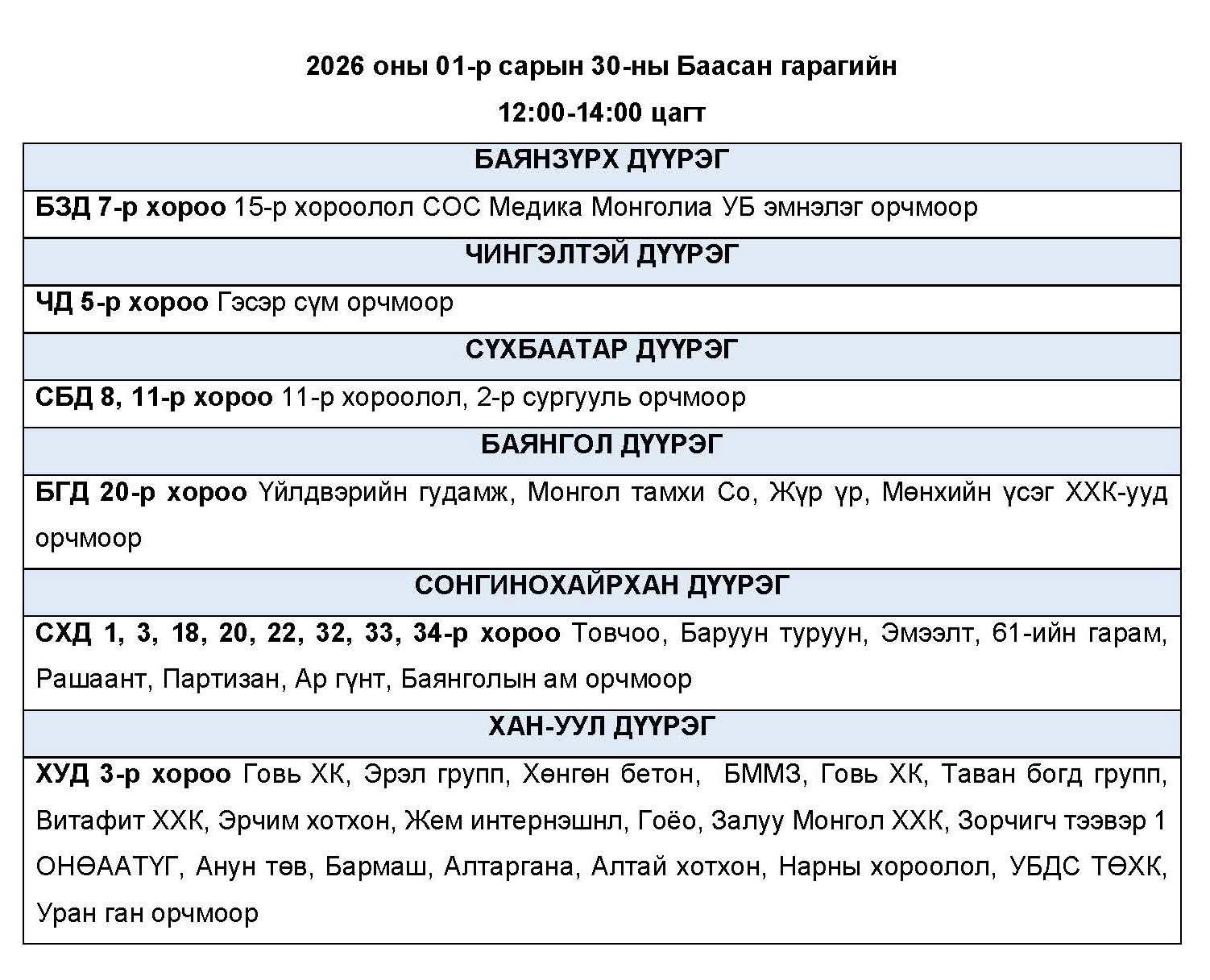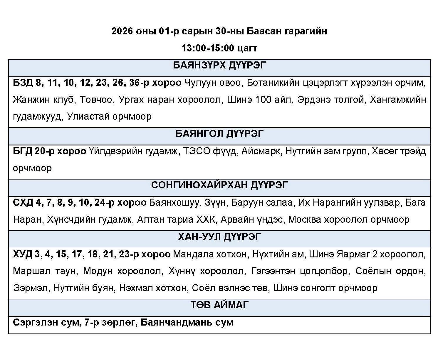 Эрчим хүчний системд аваарын горим үүсэхээс сэргийлэн нэгдсэн сүлжээнд холбогддог тодорхой байршлуудад цахилгаан эрчим хүчний төлөвлөсөн хэрэглээг “Диспетчерийн үндэсний төв” ТӨХХК-ийн шийдвэрээр хуваарийн дагуу 2 цагийн хугацаатай хязгаарлах арга хэмжээ авч байна.