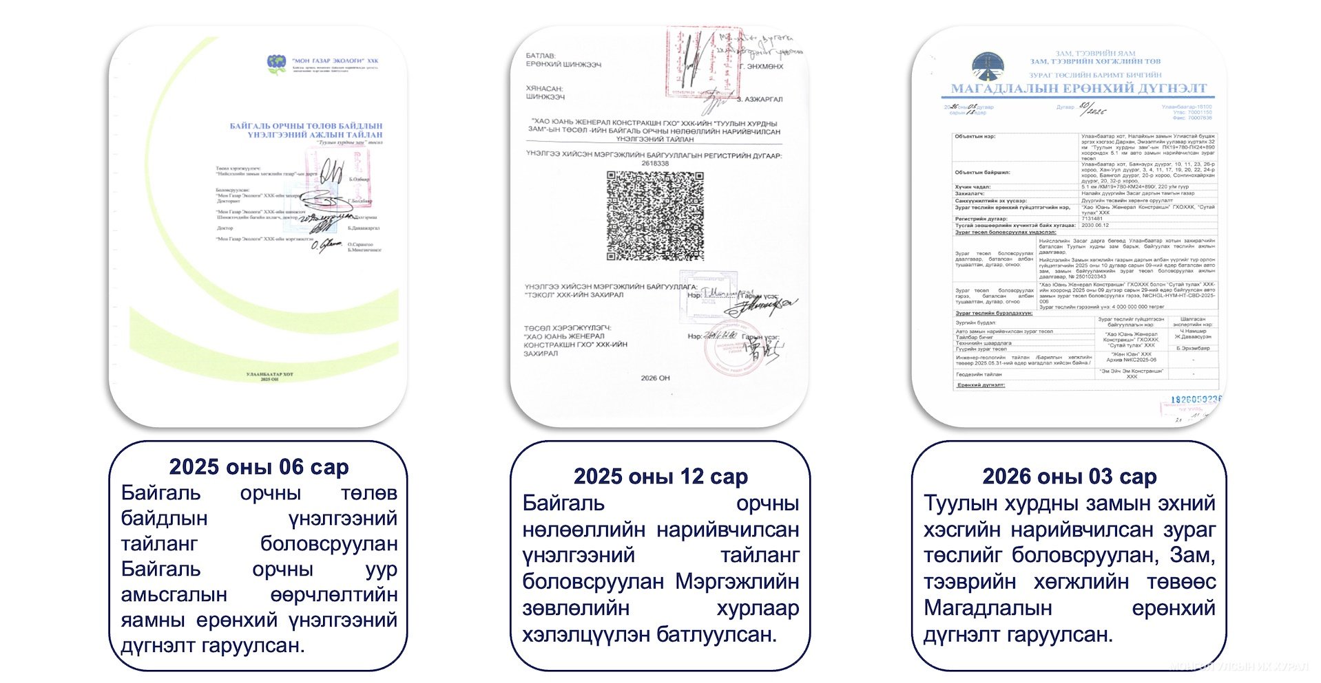 Тэрбээр, энэхүү төслийг анх Улаанбаатар хотын бодлого, судалгааны институц болон Улаанбаатар хот байгуулалтын газар 2008 оноос төлөвлөж эхлээд 2013 онд Монгол Улсын Засгийн газрын 307 дугаар тогтоолоор хурдны зам барих тухай солбилцол батлах тухай тогтоолоор албажсан гэж байлаа. 2014 онд дөрвөн эгнээ бүхий нийт 36 км замын техник эдийн засгийн үндэслэл урьдчилсан зураг, төслийг гүйцэтгэсэн. 2013 ондоо байгаль орчны нарийвчилсан үнэлгээ анх батлагдсан байдаг байна.Энэ талаарх мэдээллийг доорх зурагнаас харна уу.